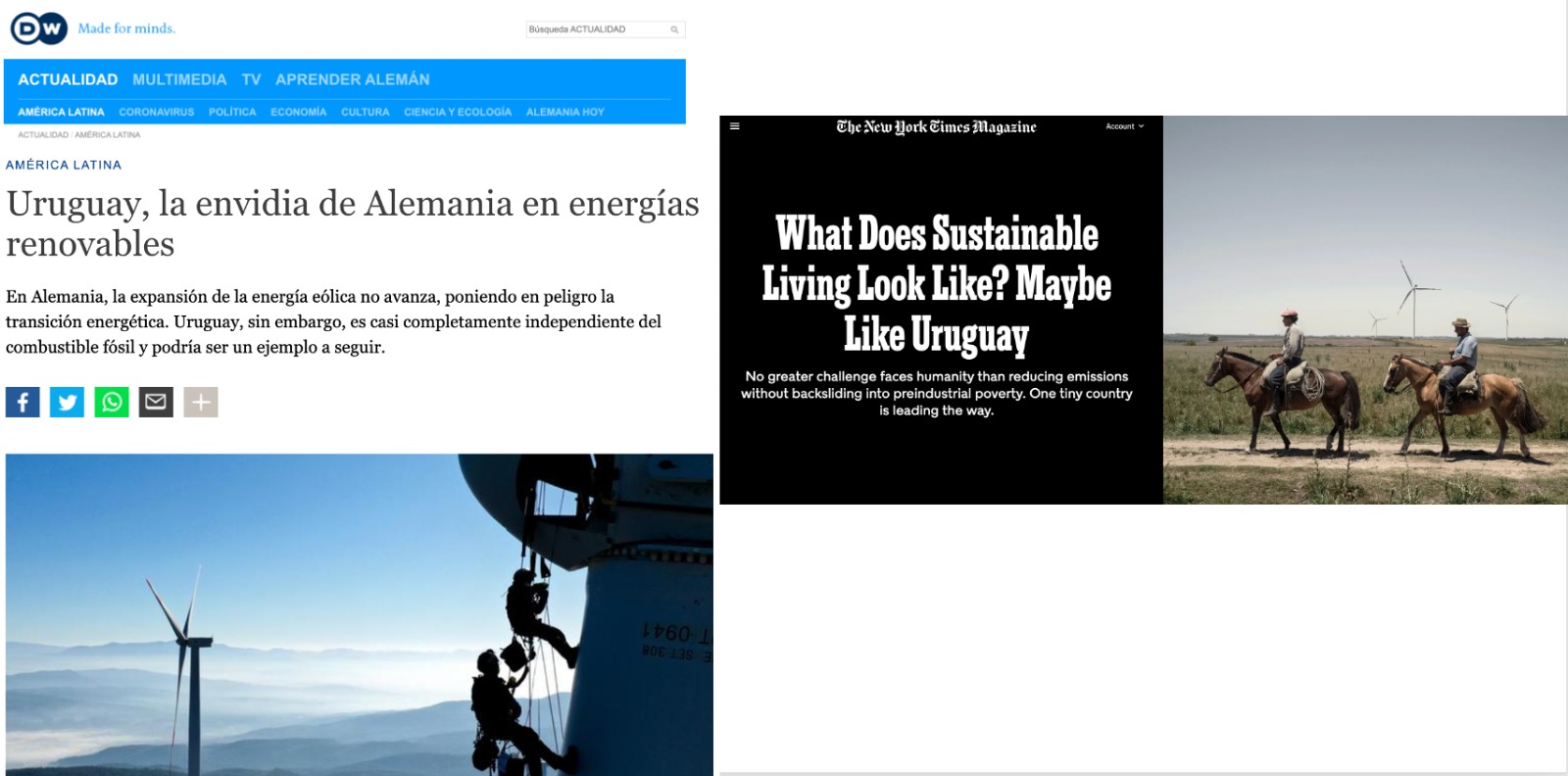 En el primer caso (https://p.dw.com/p/4HjvW) se compara la realidad de Alemania con la de Uruguay, «en Alemania, la expansión de la energía eólica no avanza, poniendo en peligro la transición energética. Uruguay, sin embargo, es casi completamente independiente del combustible fósil y podría ser un ejemplo a seguir», para luego describir las dos realidades y destacar los orígenes y acuerdos en torno a una política pública que terminó poniendo a Uruguay en los primeros lugares del mundo, y en este caso «la envidia de Alemania».