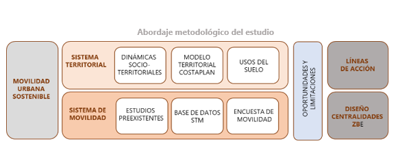 En su desarrollo se adoptó una aproximación metodológica que combina dos perspectivas de análisis de la ciudad: desde el sistema territorial y desde el sistema de movilidad. Y a partir de este análisis de diagnóstico se identificaron las líneas de acción para impulsar la transición hacia la movilidad urbana sostenible.